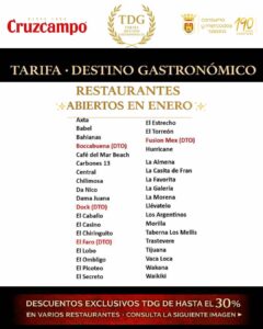 Restaurante BoccaBuena: 30 % de descuento pidiendo a la carta (bebidas no incluidas). Esta promoción es válida hasta final de temporada (1 de febrero) para reservas realizadas con el código TARIFA DESTINO GASTRONÓMICO.