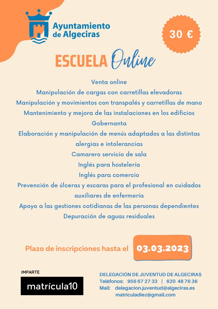 Francisco Javier Arango, el concejal delegado de Juventud, ha comunicado que ya se ha abierto  el plazo de inscripción para los cursos de enseñanza online que oferta el Ayuntamiento de Algeciras a través de la empresa Matrícula 10. Estos cursos tienen un coste de 30 euros y la matrícula queda abierta hasta el próximo 3 de marzo.