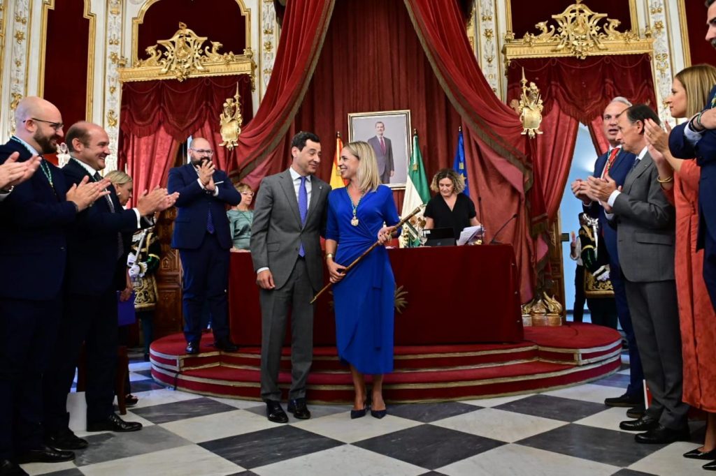 A las 10.50 horas, la diputada provincial socialista Carmen Collado hizo entrega a Almudena Martínez del Junco del bastón de mando de la Diputación de Cádiz tras ser elegida presidenta, tal y como estaba prevista, con los catorce votos del grupo popular y los dos representantes de La Línea 100×100, que se integran en el equipo de Gobierno. El presidente de la Junta de Andalucía, Juanma Moreno, se fotografió con la jerezana de la que destacó, antes de que se iniciara el Pleno de Constitución de la nueva Corporación, su condición de mujer que “por talento y capacidad” asume la responsabilidad de ponerse al frente de una de las instituciones provinciales más importantes de la comunidad autónoma y contribuye, de este modo, a la lucha por la igualdad.