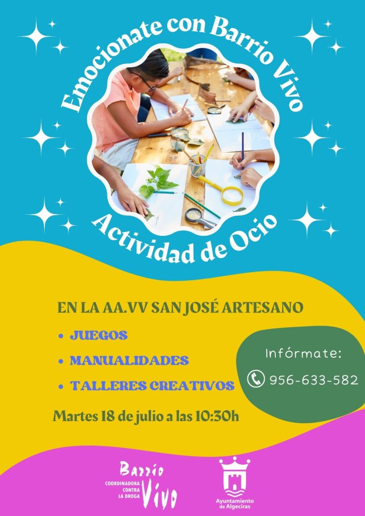 Entre las distintas propuestas, este martes, día 18 de julio se llevará a cabo una actividad de ocio junto a la parroquia de la Santísima Trinidad, en San José Artesano. Desde las 10:30 hasta las 13:30 horas los menores podrán participar en juegos, actividades de manualidades y talleres creativos. Esta iniciativa forma parte del proyecto preventivo contra las adicciones a través del ocio educativo-emocional ‘Emociónate con Barrio Vivo’, subvencionado por el Ayuntamiento de Algeciras.