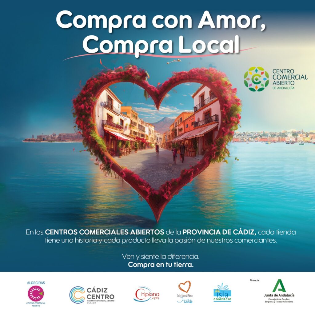 Empleo lanza la campaña «Compra con Amor. Compra Local» para impulsar los Centros Comerciales Abiertos de la provincia de Cádiz. La campaña, que se promocionará en autobuses, radios, televisión y plataformas digitales, busca fomentar y revitalizar el comercio de proximidad