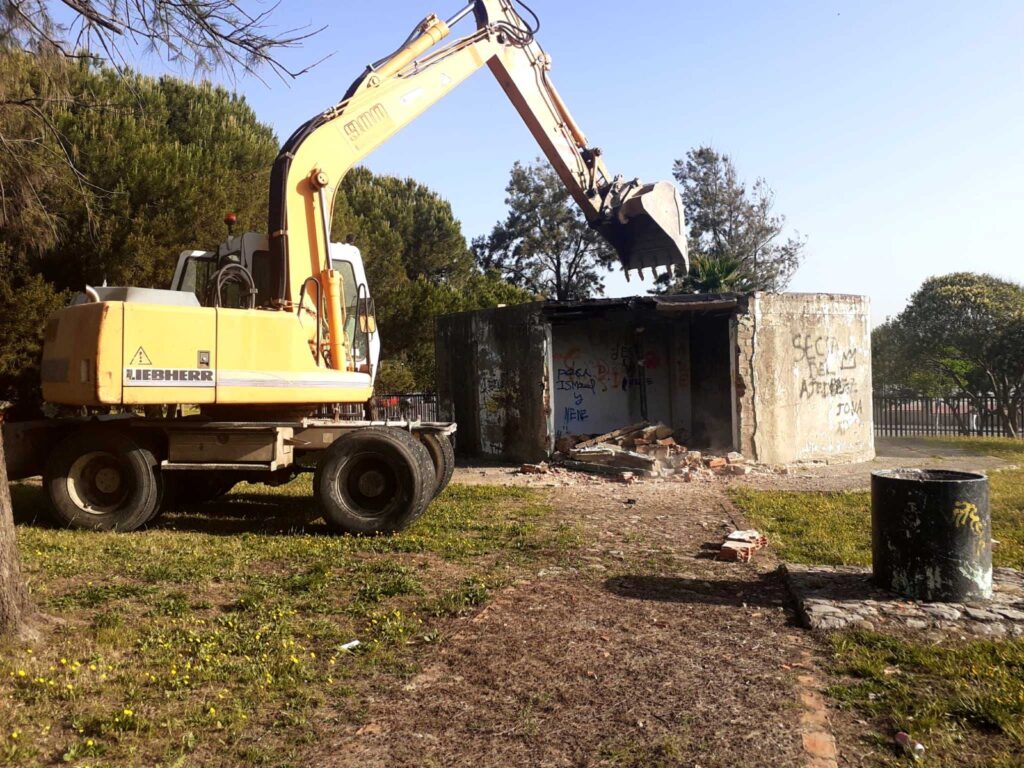 Para ejecutar los trabajos se ha contado con una retroexcavadora de gran tonelaje, un camión con bañera y tres operarios. Una vez retirados los escombros resultantes del derribo, se ha mantenido la solera de la estructura para poder ubicar sobre ella nuevo equipamiento y mobiliario urbano para que sea disfrutado por los usuarios del parque.