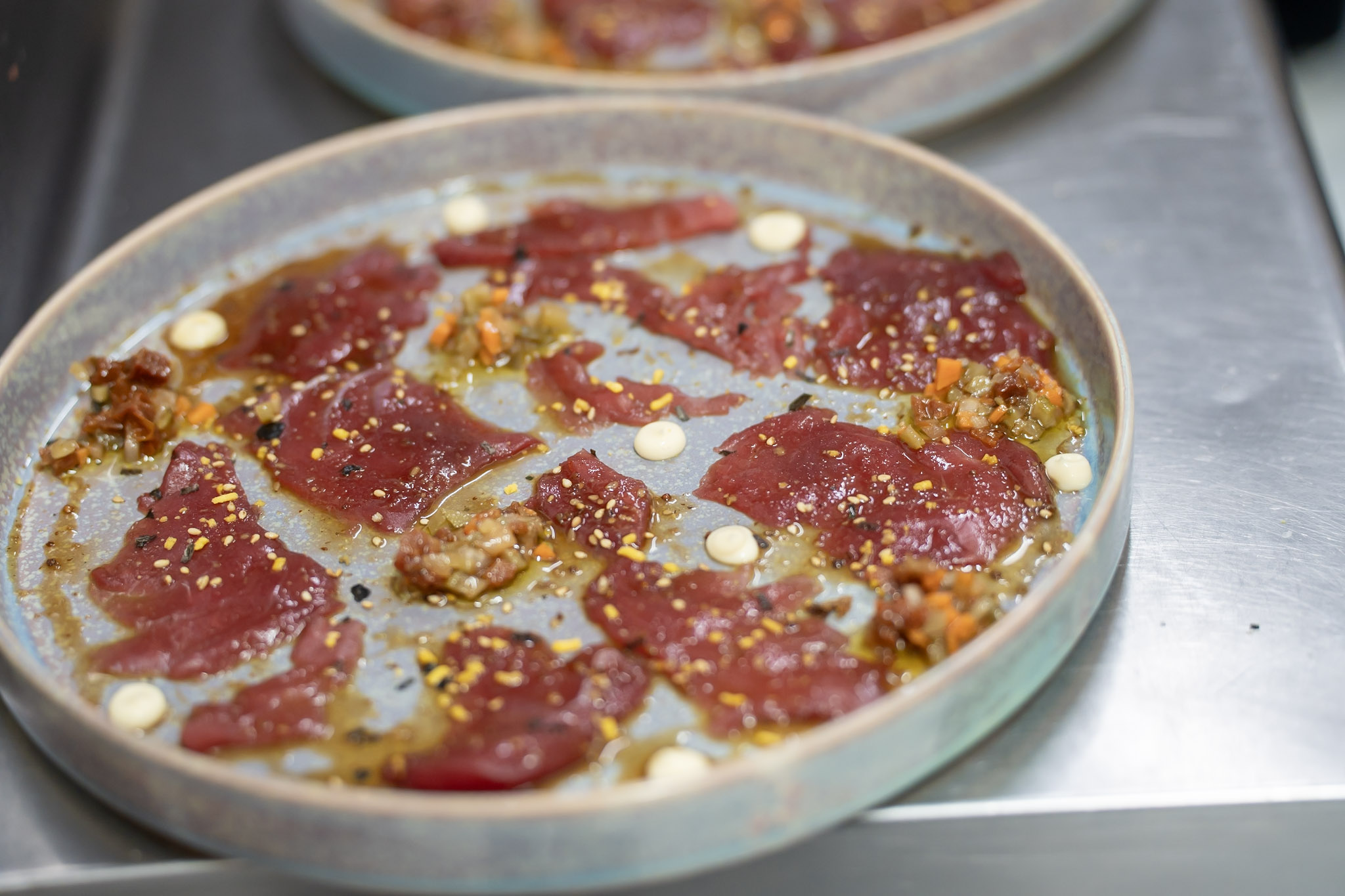 Tiradito de atún con picada mediterránea y mayonesa japo