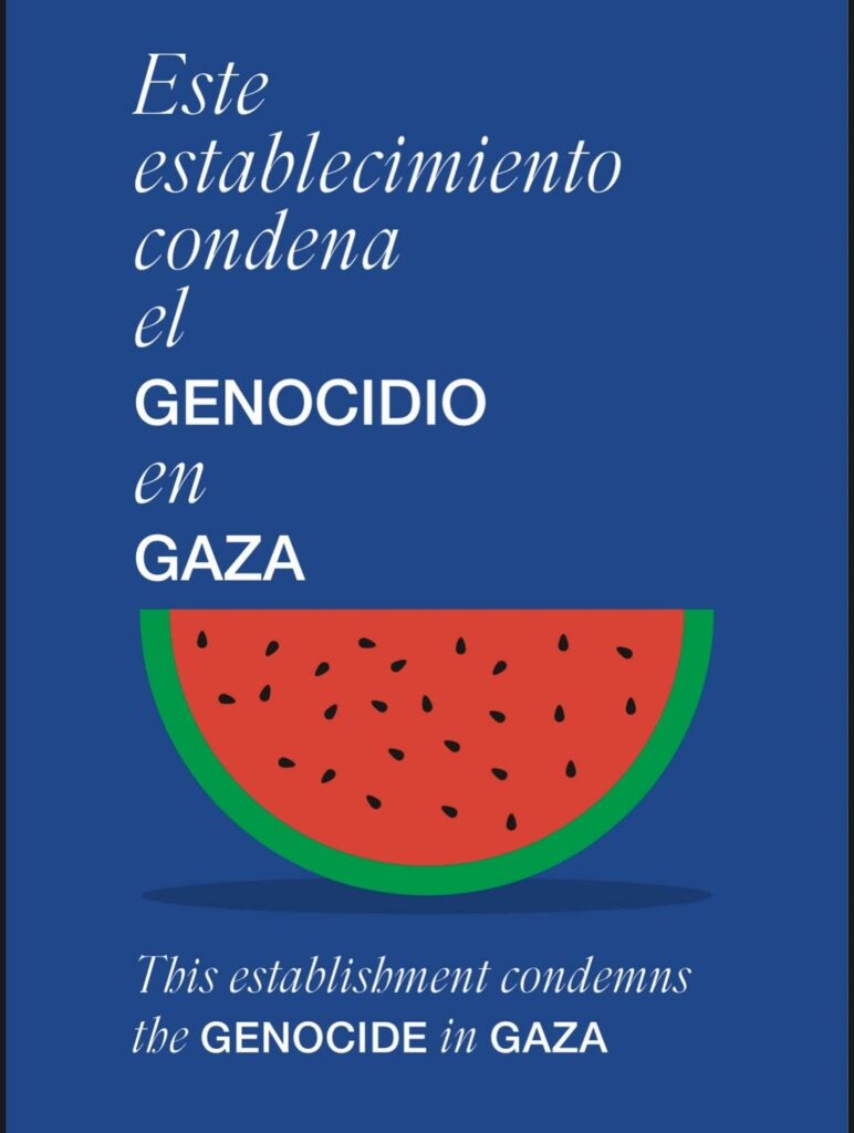 El cartel incluye la imagen de una sandía, convertida en símbolo de resistencia palestina desde hace años. Su piel verde, la pulpa roja y las semillas negras representan los colores de la bandera palestina. Este fruto comenzó a utilizarse como símbolo tras la Primera Intifada, cuando las autoridades israelíes prohibieron el uso de la bandera palestina en espacios públicos. Como respuesta, activistas comenzaron a mostrar sandías en manifestaciones, arte y expresiones culturales, convirtiéndola en una forma silenciosa —pero poderosa— de protesta.