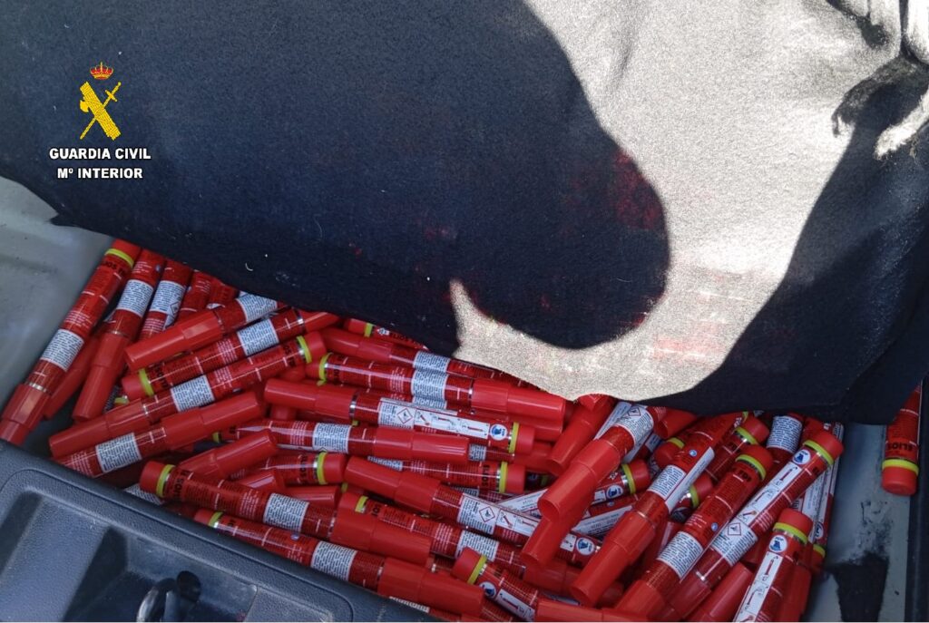 Los guardias civiles descubrieron bengalas ocultas en un vehículo que se disponía a embarcar con destino a Tánger. El conductor transportaba el material pirotécnico, con 170 kilos de masa explosiva, sin las mínimas medidas de seguridad, originando un grave peligro para la seguridad de los viajeros