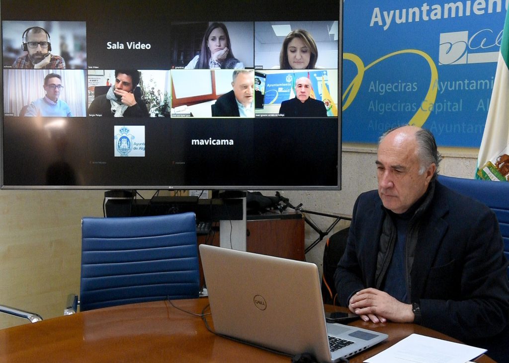 El alcalde de Algeciras, José Ignacio Landaluce, acompañado del teniente de alcalde delegado de Mercados, Sergio Pelayo, ha presidido la Junta General de Accionistas y la reunión del Consejo de Administración de la empresa Mercalgeciras SA, que se han celebrado de forma telemática.