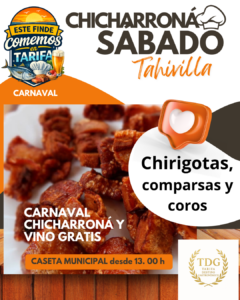 Este sábado en la Caseta Municipal tendrá lugar desde la 13:00 h la Chicharroná popular del carnaval de Tahivilla, y a partir de las 16:00 h chirigotas, coros y comparsas llenarán de carnaval y alegría el ambiente, el sabor ya lo ponen los chicharrones.