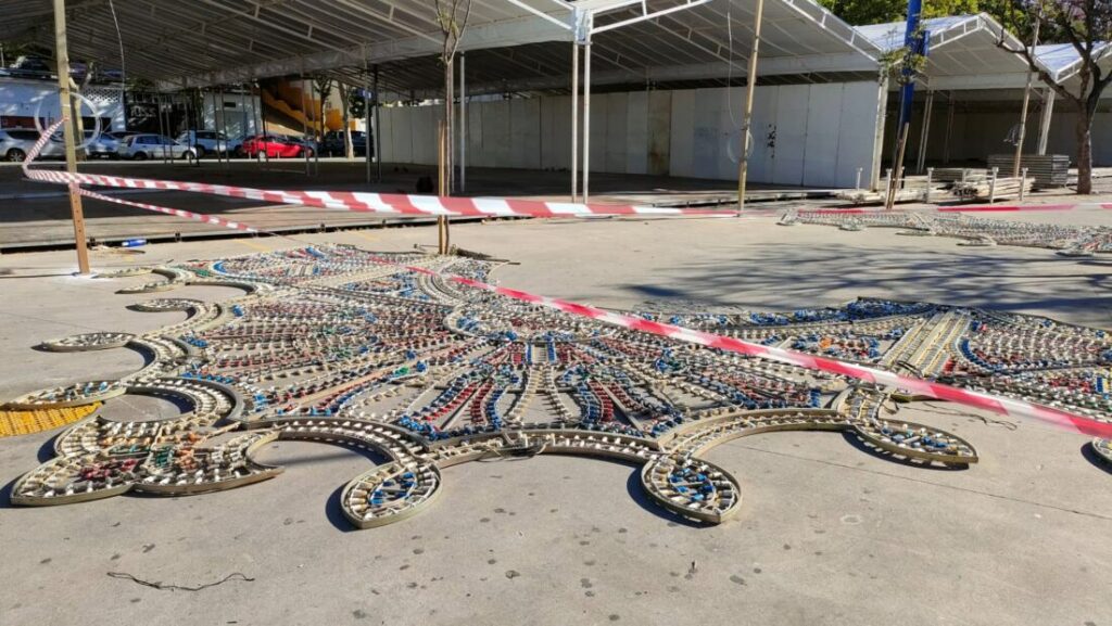 Hace más de un mes que empezaron a montar la feria, ayer el recinto ferial está completamente por hacerse, sucio y parece abandonado incluyendo mobiliario urbano destrozado, camiones y vehículos industriales conviviendo con niñ@s corriendo en un recinto peatonal…. Ahora esto, poco pasa la verdad…