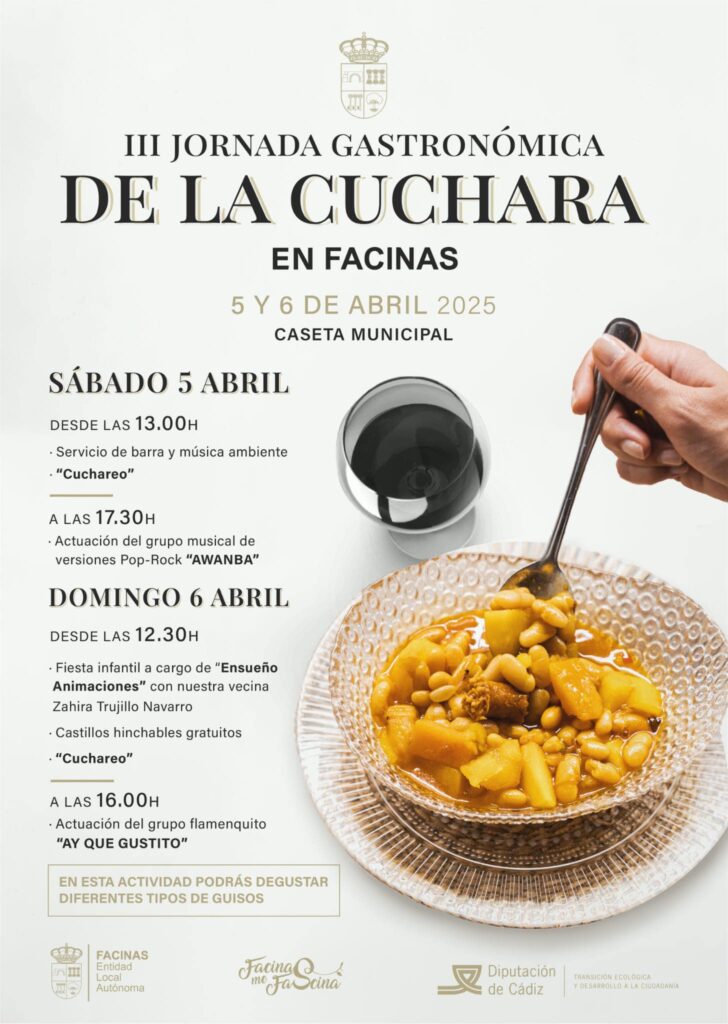 Este fin de semana, del 5 a 6 de abril, vuelve la Jornada Gastronómica de la Cuchara a Facinas. Tarifa Destino Gastronómico estará presente en la cita, estas jornadas serán las protagonistas de la próxima entrega del programa de TV de 7TV emitido para todo el campo de Gibraltar. PRECIOS POPULARES