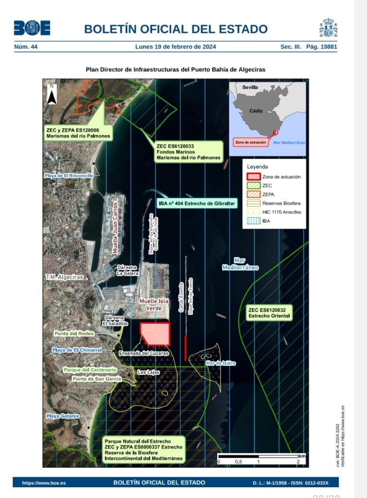 En esta resolución de 19 de febrero de 2024 donde la Dirección General resuelve que la alternativa de desarrollo hacia el Parque Natural del Estrecho del «Plan Director de Infraestructuras del Puerto Bahía de Algeciras» puede suponer afecciones significativas a especies incluidas en el Catálogo Español de Especies Amenazadas como «En peligro de extinción» y como «Vulnerables»; afecciones sobre la integridad de la Red Natura 2000 y otros espacios naturales protegidos; así como afecciones sobre la población debidas a contaminación acústica, contaminación atmosférica, afección a las aguas de baño y a las playas, demuestra que el puerto de Algeciras debe cambiar de acción y “fomentar el arraigo a la población” que circunda la Bahía de Algeciras.