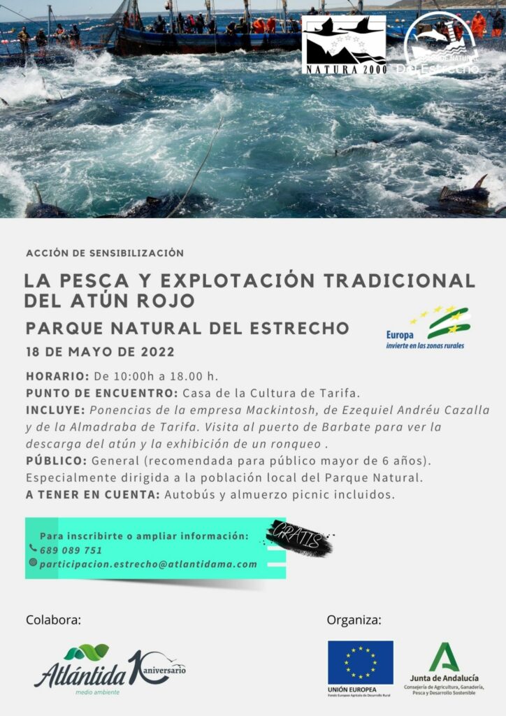 Esta jornada comenzará en la Casa de la Cultura de Tarifa el próximo 18 de mayo a partir de las 10:00 de la mañana hasta las 18:00 horas de la tarde. Las personas que se inscriban podrán disfrutar de diferentes ponencias de la empresa Mackintosh, de Ezequiel Andréu Cazalla y de la Almadraba de Tarifa. Además, la programación cuenta con una visita al puerto de Barbate y los inscritos podrán ver en directo el famoso ronqueo de un atún.