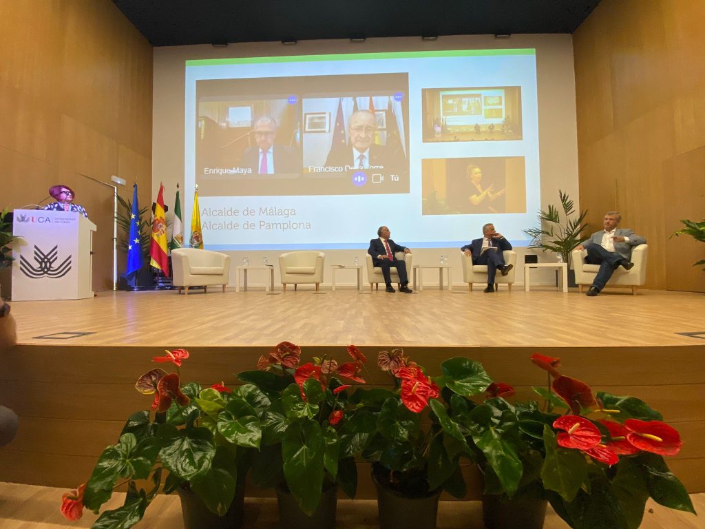La mesa redonda en la que participaron los alcaldes Enrique Maya alcalde de Pamplona, José María García Urbano alcalde de Estepona, Juan Pérez Guerrero alcalde de Lucena, Francisco de la Torre alcalde de Málaga y el alcalde anfitrión José Ignacio Landaluce alcalde de Algeciras, se desarrolló en una temática dirigida a la creación de ciudades para los ciudadanos, los alcaldes compartieron planes y experiencias con la finalidad de enriquecer y prospectar la transformación ecológica y tecnológica de las ciudades. “Esto no es ni de derechas ni de izquierdas, es algo en lo que sí o sí tenemos que estar implicados porque es algo imprescindible”, dijo el primer edil de Pamplona Enrique Maya, el objetivo para el alcalde es hacer de Pamplona “la ciudad del conocimiento”, “los esfuerzos están puestos para que la ciudad mejore y se adapte para atraer a las personas para que puedan vivir aquí, aún quedan cosas importantes como la llegada del tren de alta velocidad, pero es una ciudad casi terminada”, concluyó Enrique Maya. Pamplona tiene una agenda elaborada desde abril del 2021 y constituye un proceso muy interesante debido a que es gobernada en coalición y han firmado su agenda en unanimidad con 57 proyectos estratégicos, elaborándolos de forma genérica, para Maya “el gran salto que tenemos que dar los alcaldes es pasar de las obras a la actividad económica, dotar de actividad a los barrios, crear centros atractivos… “Uno de los principales objetivos con la puesta en marcha de los planes de la Agenda 2030 será luchar por la sostenibilidad turística, aunque el principal atractivo turístico sean los San Fermines y apostarán por la pelota vasca para convertir a Pamplona en la capital mundial de este deporte”.
