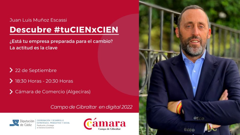 La Cámara de Comercio del Campo de Gibraltar acoge el próximo jueves 22 de septiembre una conferencia de Juan Luis Muñoz Escassi en la que compartirá su experiencia a través de la conferencia Descubre #tuCIENxCIEN. Esta sesión está organizada por la entidad cameral y la Diputación de Cádiz, a través de los fondos Dipuactiva 2020-2022, y tendrá lugar a partir de las 18.30 horas de la tarde.