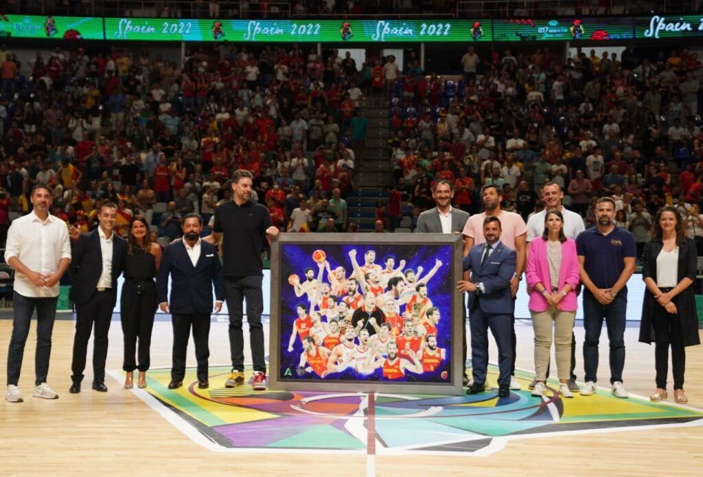 El momento cumbre sucedió durante el medio tiempo del partido cuando aparecieron varias Leyendas de “La Familia” como Pau Gasol, Jorge Garbajosa, Juan Carlos Navarro, Felipe Reyes, Carlos Cabezas… protagonistas de la Obra del artista que ha conseguido unir con sus pinceles a las dos Selecciones Campeonas del Mundo en 2006 (Japón) y 2019 (China).
