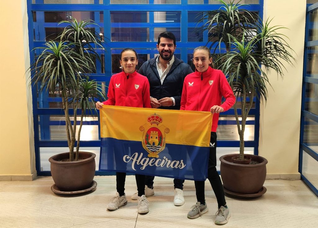 El teniente de alcalde delegado de Deporte, Jorge Juliá, ha hecho entrega de la bandera de la ciudad a las jugadoras de futbol algecireñas Triana Pérez Clavijo y Daniela Gómez Troyano, que juegan en el Sevilla CF en la categoría alevín femenino.
