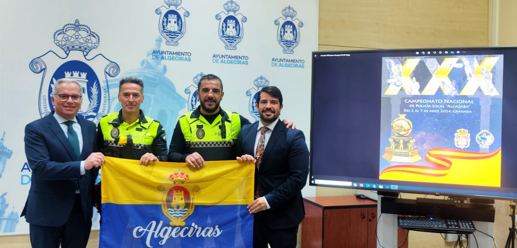El teniente de alcalde delegado de Seguridad Ciudadana, Jacinto Muñoz, junto con el teniente de alcalde delegado de Deportes, Jorge Juliá, han hecho entrega de la bandera de Algeciras a los agentes de la Policía Local de Algeciras que participan desde hoy hasta el próximo día 6 de abril en la XXX edición del Campeonato Nacional de Policías Locales.