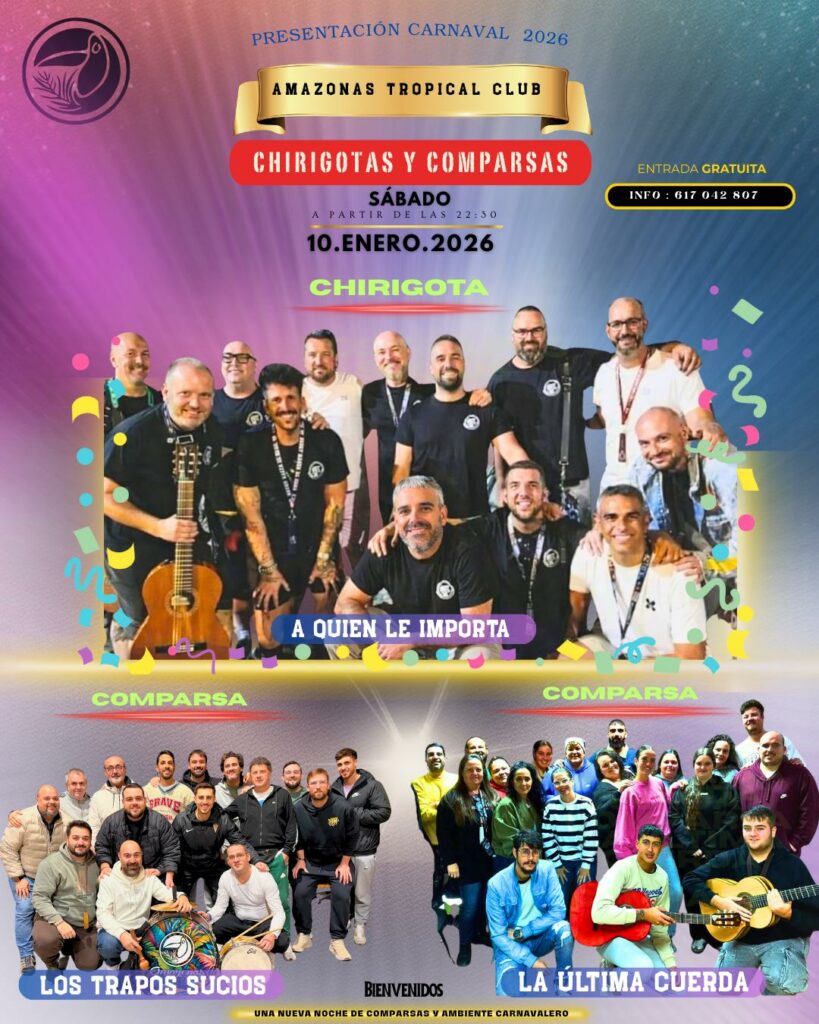La comarca se prepara para vivir el ambiente carnavalero con la Presentación del Carnaval 2026, que tendrá lugar el próximo sábado 10 de enero, a partir de las 22:30 horas, en el Amazonas Tropical Club. El evento contará con entrada gratuita y promete una noche cargada de coplas, humor y tradición.