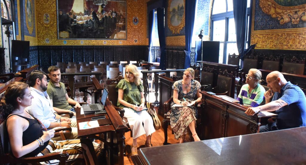 La teniente de alcalde delegada de Turismo y Coordinación, Susana Pérez Custodio, junto a las tenientes de alcalde delegadas de Cultura, Pilar Pintor; Feria y Fiestas, Juana Cid, e Igualdad y Bienestar Social, Paula Conesa, además de los concejales de Participación Ciudadana, Jorge Juliá, y de Juventud, Francisco Javier Arango, ha mantenido una reunión de trabajo con Faustino Peralta, organizador de Algeciras Entremares, para perfilar la celebración de la Fiesta de las Culturas del Estrecho, que volverá a celebrarse el próximo mes de septiembre tras dos años de obligada ausencia a consecuencia de la pandemia.