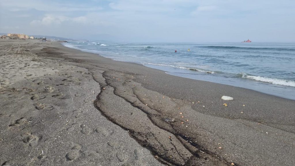 La orilla de la playa de Santa Bárbara está manchada con depósitos de residuos procedentes del ‘OS 35’ y en la zona se aprecia, según indica el alcalde, un “fuerte olor” a hidrocarburo.