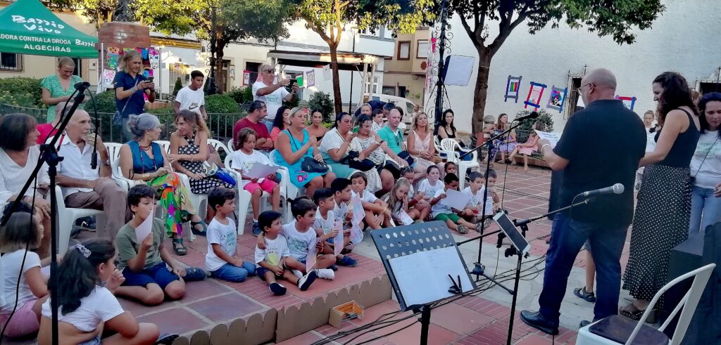 La plazoleta de san Isidro se llenó de color y contenido lúdico con la presencia de niñas y niños, como protagonistas, en el acto de clausura del campamento urbano que a lo largo de los meses de julio y agosto ha desarrollado la coordinadora contra la droga Barrio Vivo. La voz y la música de Olga Iglesias, a la guitarra acústica, y el sonido de la guitarra eléctrica de Miguel Domínguez, pusieron la nota sonora a una actividad que engalanó este rincón de Algeciras con dibujos, máscaras y otros trabajos manuales realizados por los menores de entre cinco a ocho años, que han disfrutado de una vacaciones activas y lúdicas en el Patio Alternativo de la ONG. La bienvenida recayó en Carmela Berrocal, técnica en dinamización emocional: “Aquí, hoy, los protagonistas sois vosotros, los niños”, indicó.