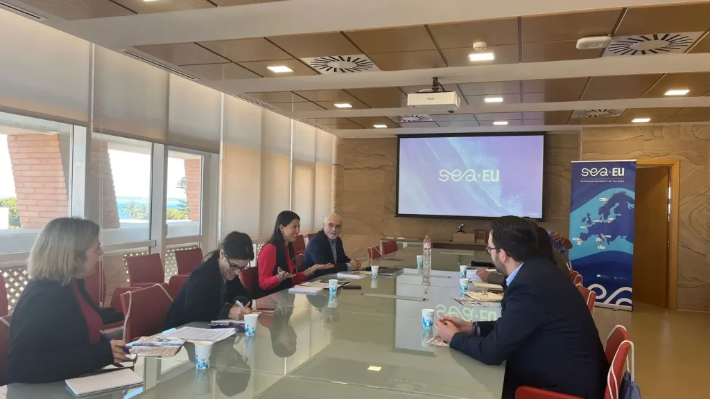 La Universidad de Cádiz ha promovido, en el marco de su trayectoria de internacionalización, una reunión con los representantes de los ayuntamientos de Algeciras, Cádiz, Jerez y Puerto Real para fortalecer las relaciones entre la Universidad Europea de los Mares (SEA-EU) y las ciudades donde tiene campus universitario. El coordinador de la Alianza SEA-EU, Fidel Echevarría, y la vicerrectora de Internacionalización de la UCA, Marcela Iglesias, actuaron como anfitriones de este encuentro estratégico, en el edificio Hospital Real, para exponer los logros recientes de este consorcio europeo integrado por nueve universidades que lidera la UCA, discutir los desafíos venideros y consolidar la participación de dichos municipios en el Consejo de Ciudades, vital para el avance de SEA-EU.
