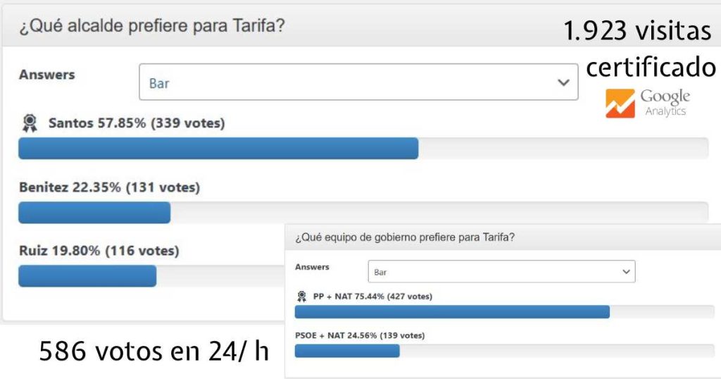 El 57,85 % de los que respondieron a la pregunta de ayer “¿Qué alcalde prefiere para Tarifa?” lo hicieron en favor del popular Santos, el 23,35 % lo hicieron Benítez de Nuevos Aires Tarifa (NAT) y un 19´80 % lo hizo por el acalde en funciones socialista Ruíz.