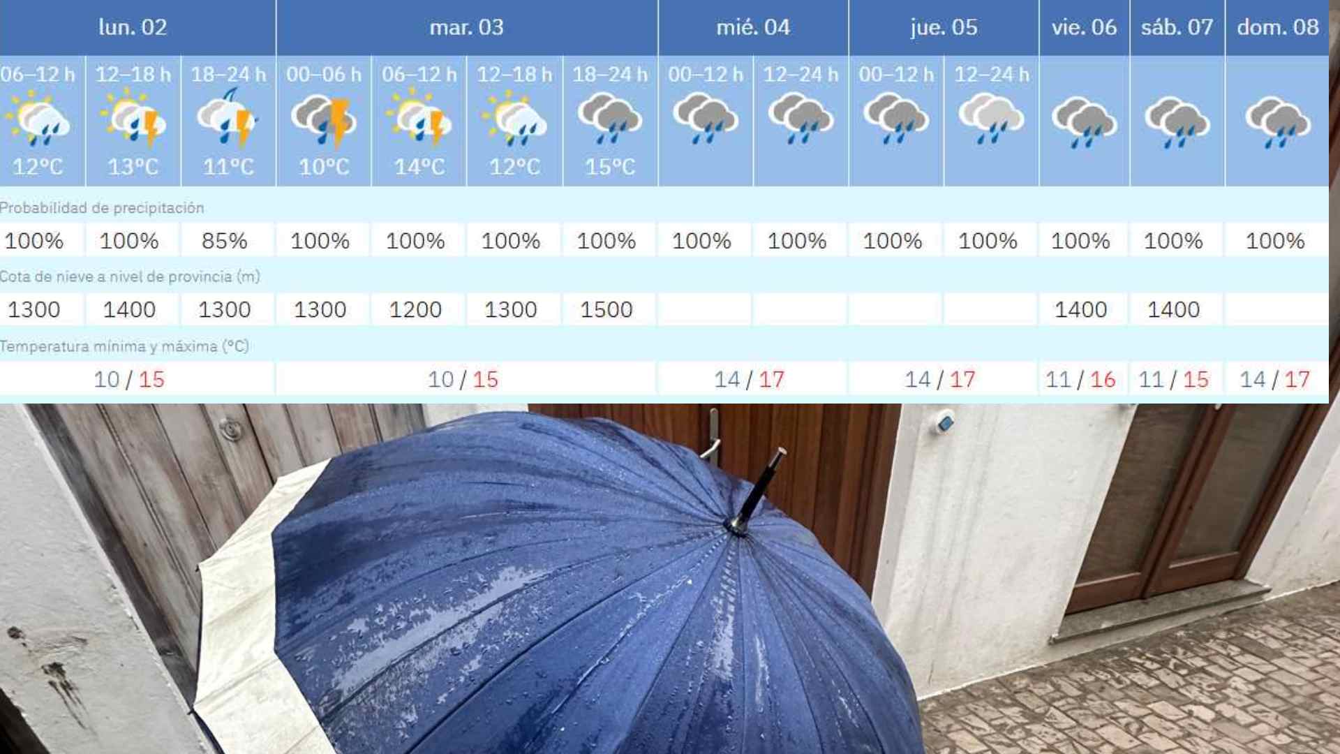 A partir del miércoles y hasta el fin de semana, el tiempo seguirá dominado por la lluvia y la nubosidad, aunque con un ligero ascenso térmico. Las máximas podrán alcanzar los 16 y 17 grados, mientras que las mínimas se situarán entre los 11 y 14 grados.