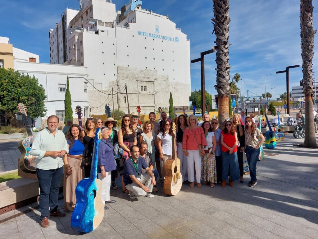 PIE DE FOTO: Pintor con los concejales y los artistas con las “Guitarras con alma” como fondo