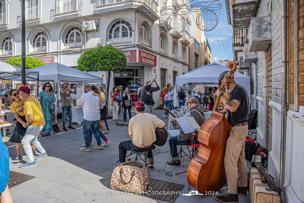 El mercado del arte ha logrado dotar de personalidad propia la «parte baja» de Algeciras. Música, exposiciones y compras son la recta que bajo la banda sonora de Honey River jazz Band. Tomoyuki Hotta nos deja las gráficas de esa jornada que reflejan una Algeciras viva…