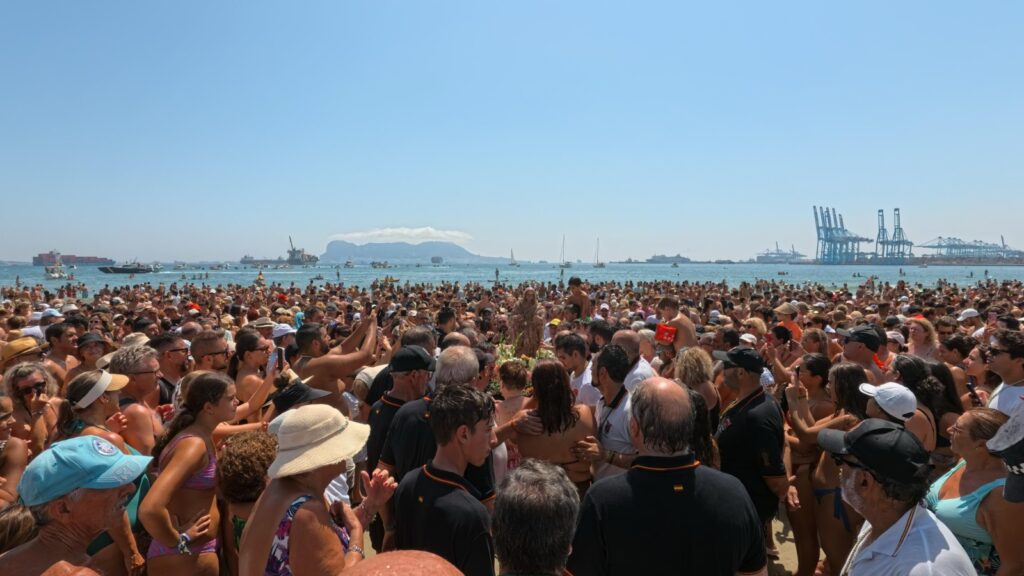Pasados unos minutos de la una del mediodía, la imagen de la patrona, que permanece refugiada en aguas de la bahía durante el resto del año, llegaba a la orilla de El Rinconcillo donde, un año más, miles de personas volvían a disfrutar del día grande de las Fiestas Patronales en Honor a la Virgen de la Palma.