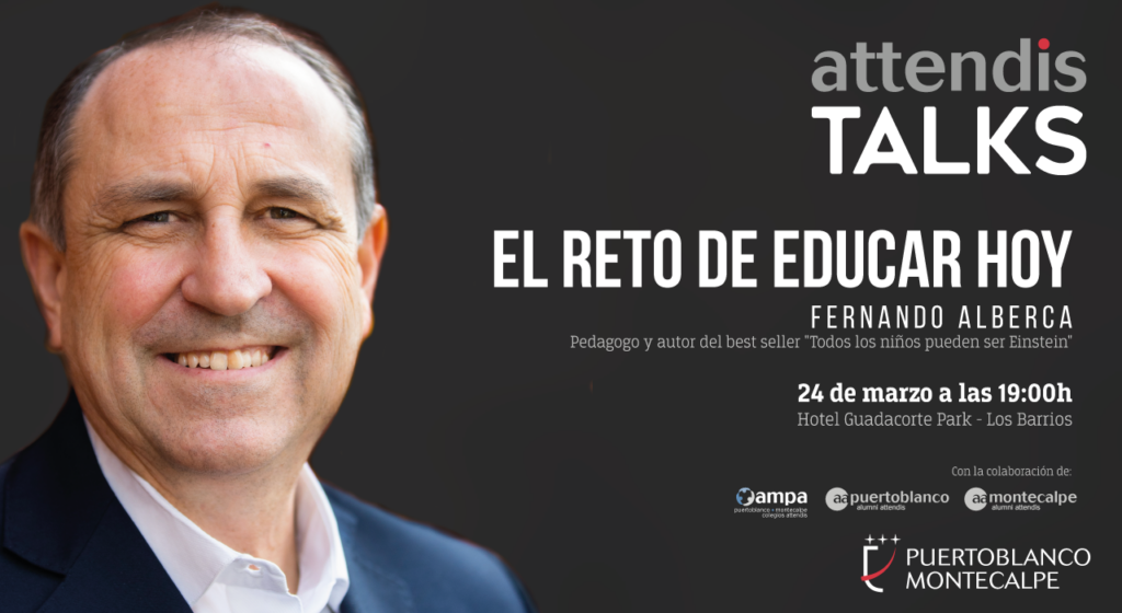En esta ocasión Puertoblanco-Montecalpe con la colaboración de las AMPAS y las asociaciones de antiguos alumnos de ambos colegios, contará con Fernando Alberca. Alberca es considerado uno de los mayores expertos del mundo en educación, motivación, creatividad y conducta del niño y adolescente. Participará en el Foro Educativo Attendis Talks bajo el título «El reto de educar hoy» donde expondrá las diferencias entre la generación de los padres actuales y sus hijos y dará claves sobre cómo gestionarlas.