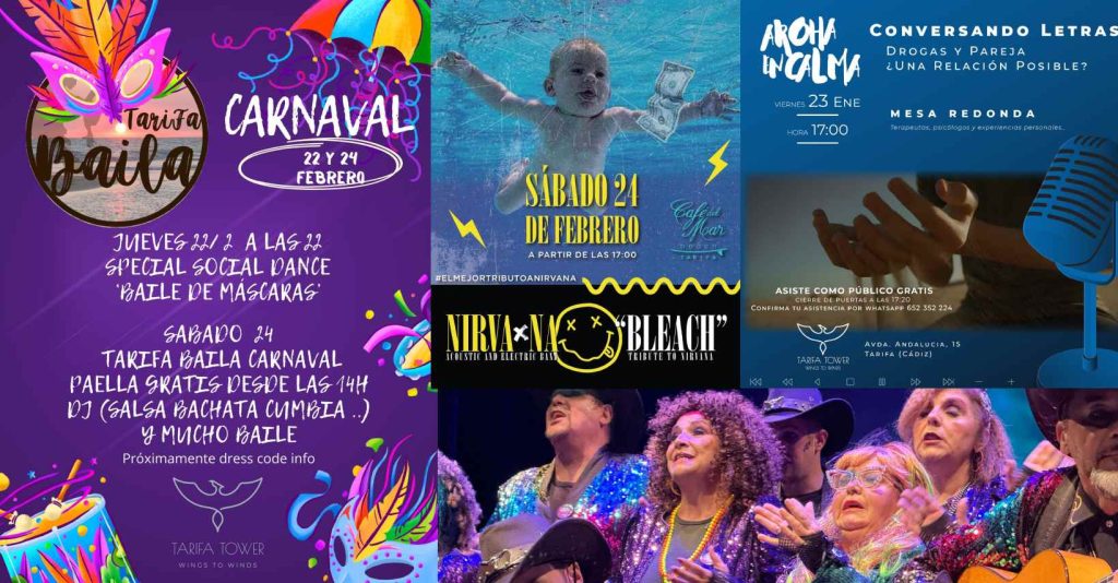 El Sábado destacar el concierto de “Bleach” tributo a Nirvana a partir de las 17.00 h en Café del Mar Beach y ese mismo día desde las 14.00 h paella gratis en Tarifa Tower con dj FEDE para bailar salsa y bachata vestidos de carnaval…
