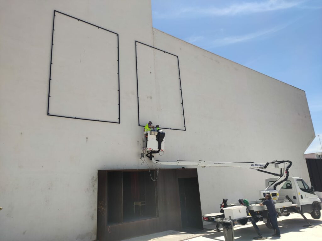 En la imagen ya se puede ir observando el montaje de los carteles en la fachada más vistosa del Teatro de la alameda.