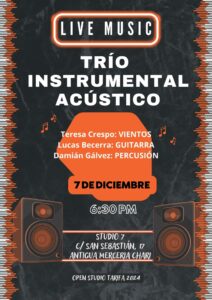 Teresa Crespo (Vientos), Lucas Becerra (Guitarra) y Damián Gálvez (Percusión) en concierto acústico hoy sábado en Tarifa 7 de diciembre de 2024