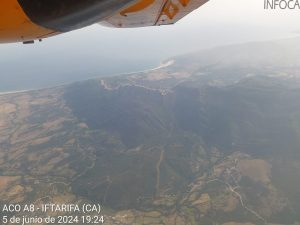 El Infoca realiza un vuelo de reconocimiento sobre la zona del fuego de Tarifa, que sigue activo 4 de junio de 2024